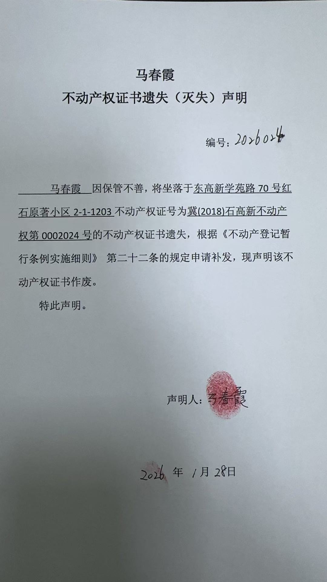 马春霞不动产权证书遗失(灭失)声明(编号:2026024)