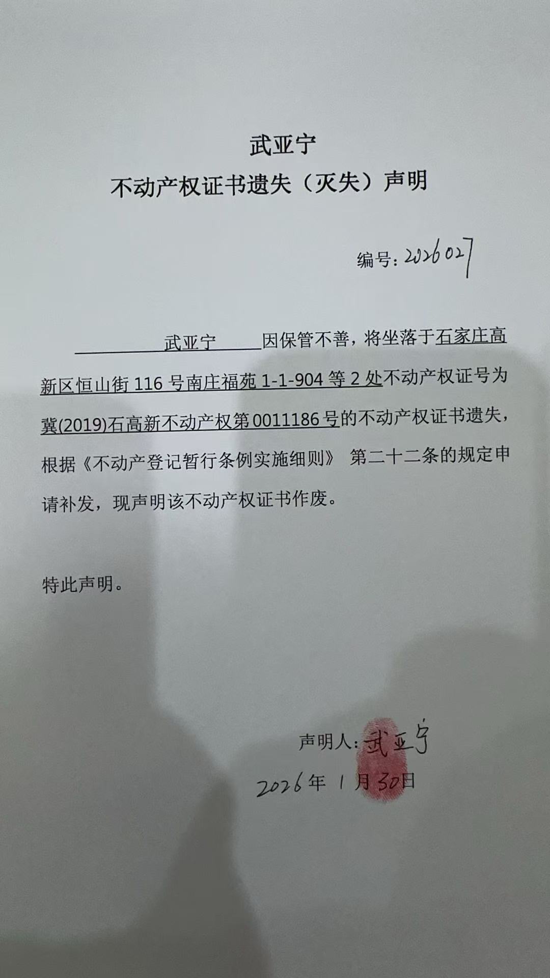 武亚宁不动产权证书遗失(灭失)声明(编号:2026027)
