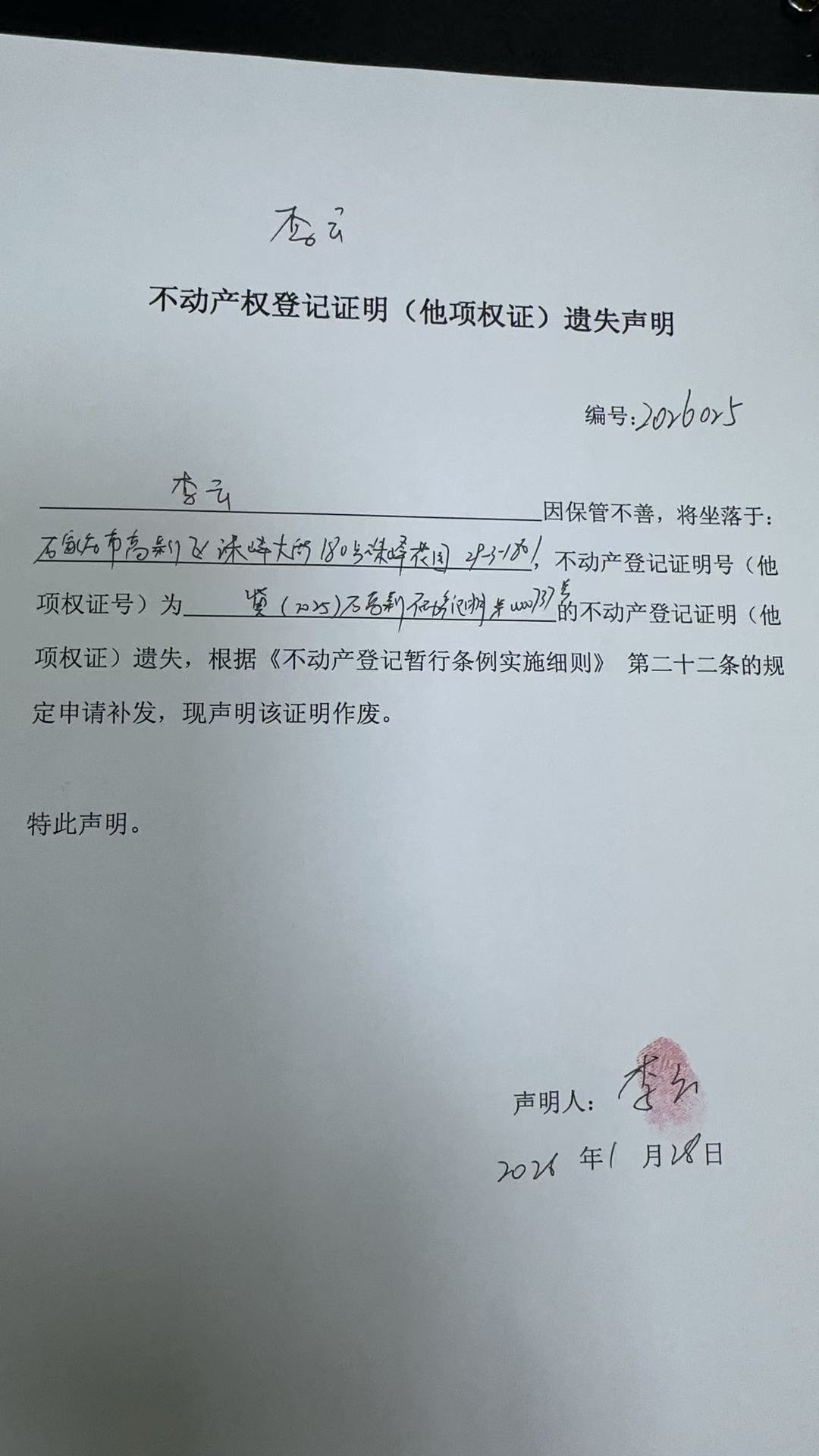 李云不动产权登记证明(他项权证)遗失声明(编号:2026025)