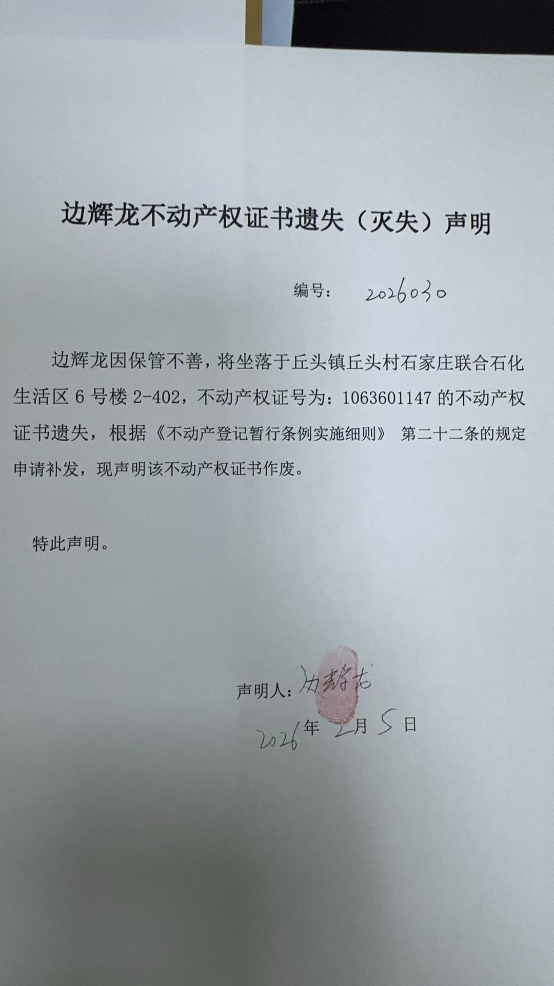 边辉龙不动产权证书遗失(灭失)声明(编号:2026030)