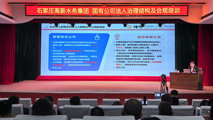 3月28日,高新水务集团组织开展国有公司法人治理结构及合规经营专项培训,旨在深入贯彻落实新《中华人民共和国公司法》《国有企业管理人员处分条例》等法律法规,全面提升企业依法治理、合规经营水平。集团领导班子成员、各部及子公司负责人、关键岗位管理人员参加。