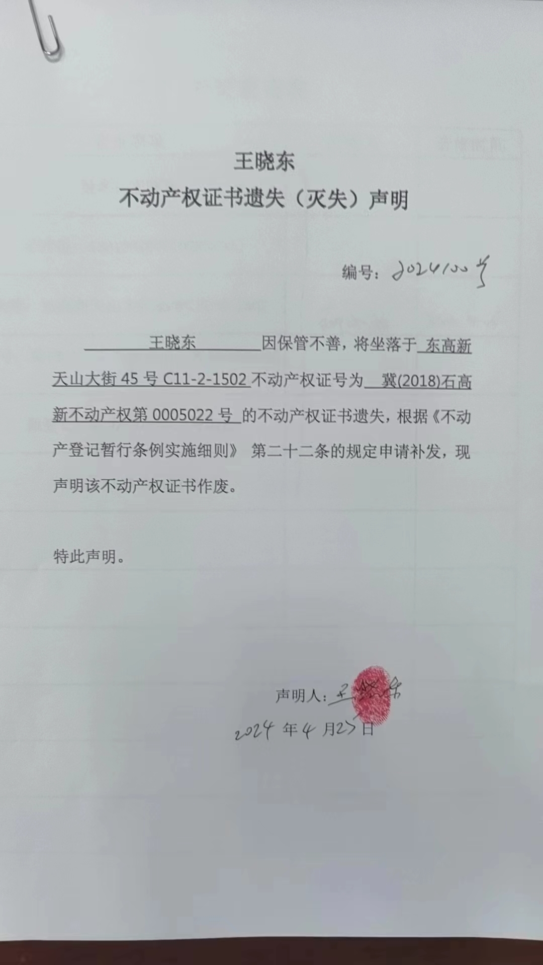 王晓东不动产权证书遗失(灭失)声明(编号:2024100号)