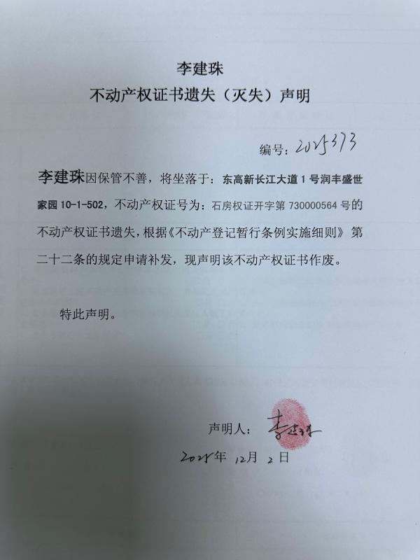 李建珠不动产权证书遗失(灭失)声明(编号:2025373)