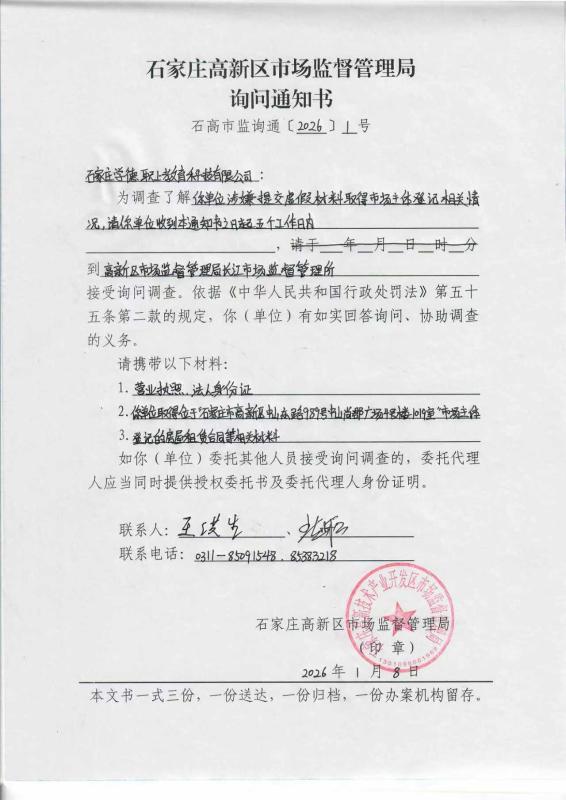 为调查了解你单位涉嫌提交虚假材料取得市场主体登记相关情况,现因你单位下落不明,依据《市场监督管理行政处罚程序规定》第八十二条第(五)项的规定,本局决定依法向你单位公告送达《询问通知书》(石高市监询通〔2026〕1号),请你单位收到本通知之日起五个工作日内到我局长江市场监管所(石家庄高新区汾河道63号,联系电话:0311-85091548/85383218)接受询问。本通知自公告发布之日起经过三十日,即视为送达。