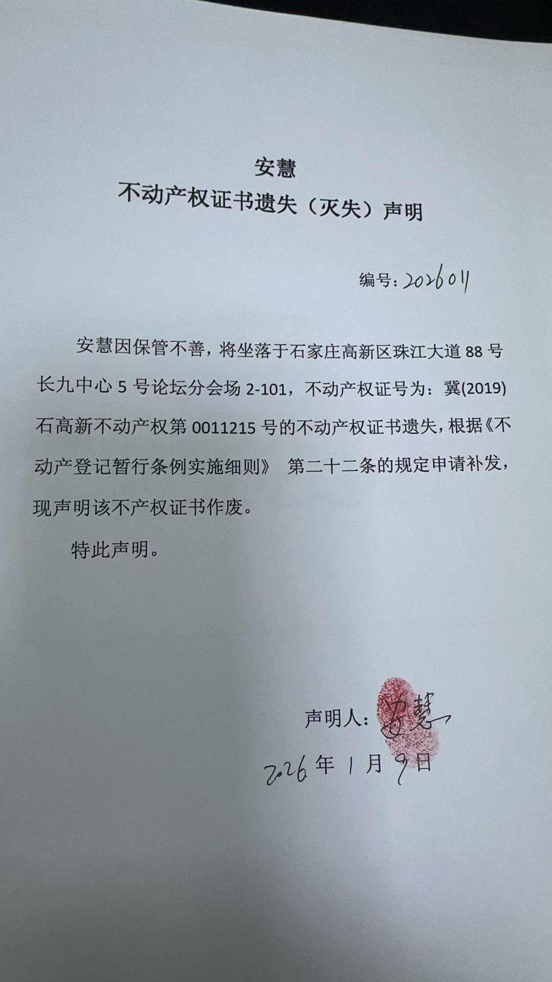 安慧不动产权证书遗失(灭失)声明(编号:2026011)