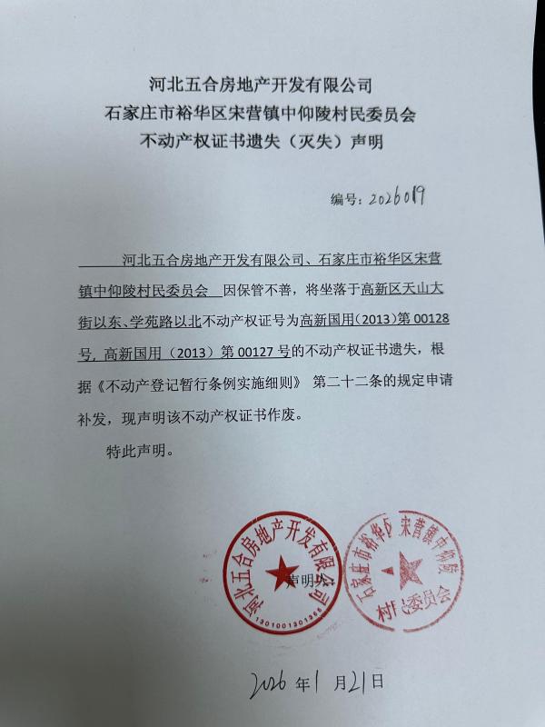 河北五合房地产开发有限公司石家庄市裕华区宋营镇中仰陵村民委员会不动产权证书遗失(灭失)声明(编号:2026019)