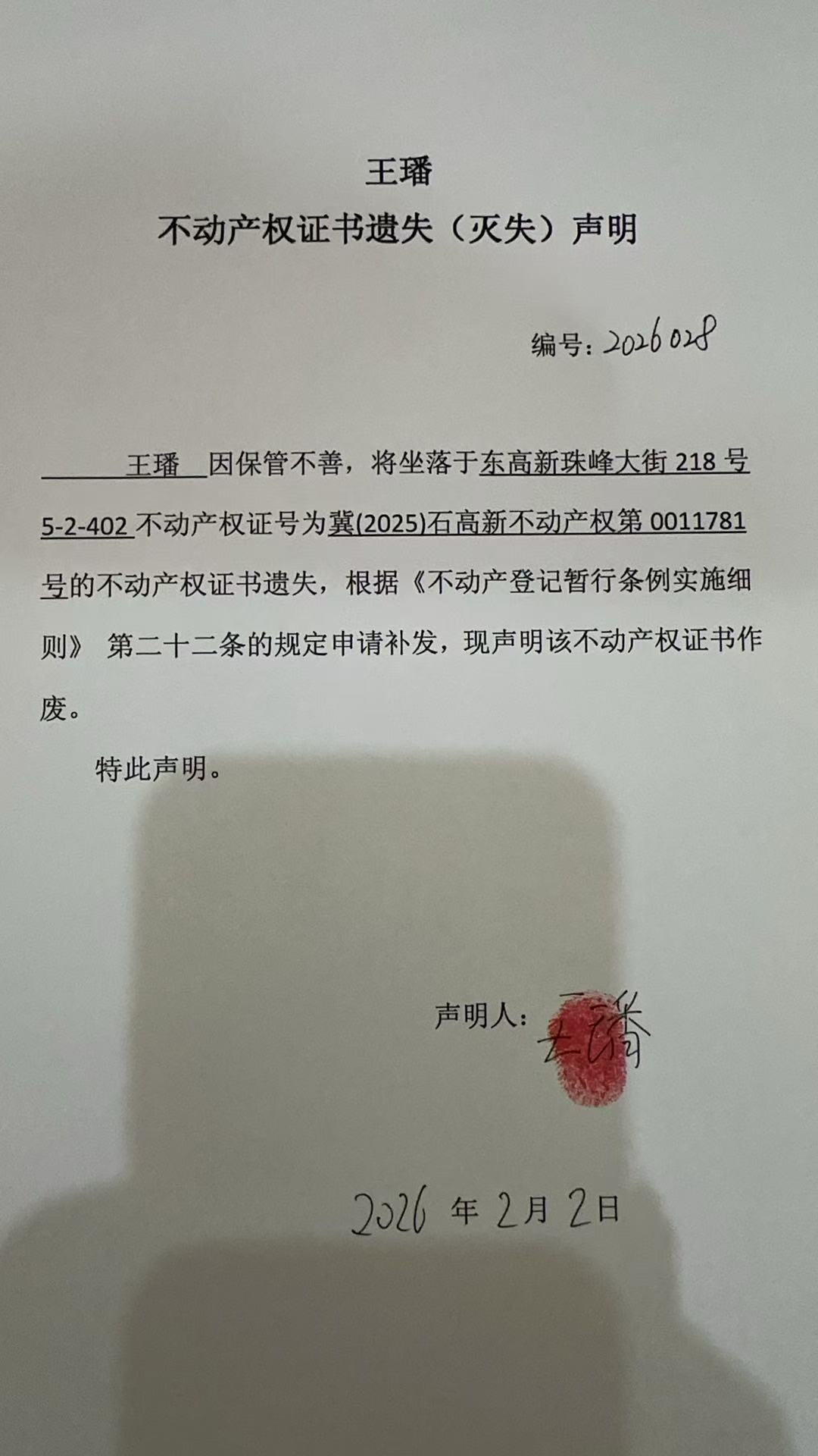 王璠不动产权证书遗失(灭失)声明(编号:2026028)