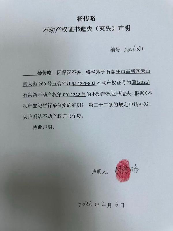 杨传略不动产权证书遗失(灭失)声明(编号:2026032)