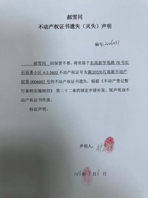 郝雪同不动产权证书遗失(灭失)声明(编号:2026031)