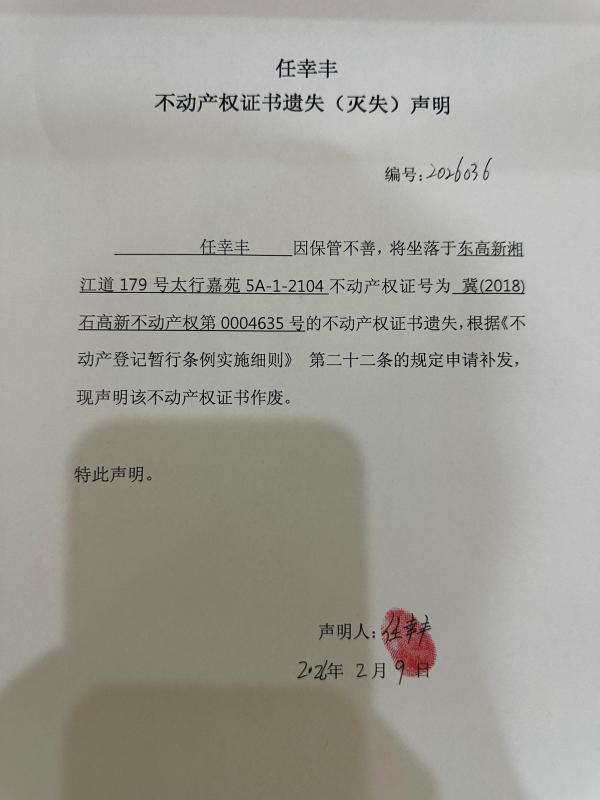 任幸丰不动产权证书遗失(灭失)声明(编号:2026036)