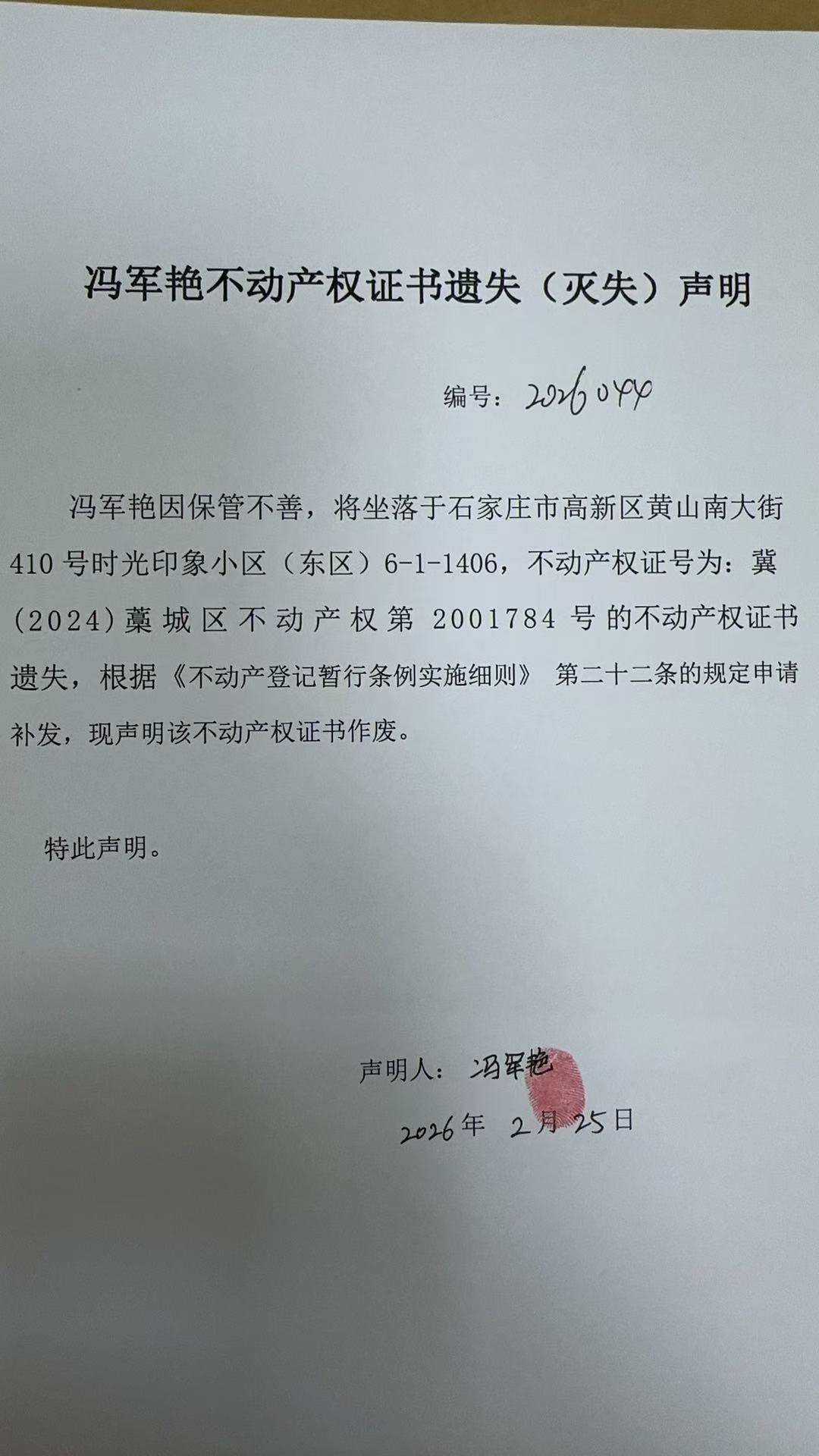 冯军艳不动产权证书遗失(灭失)声明(编号:2026044)