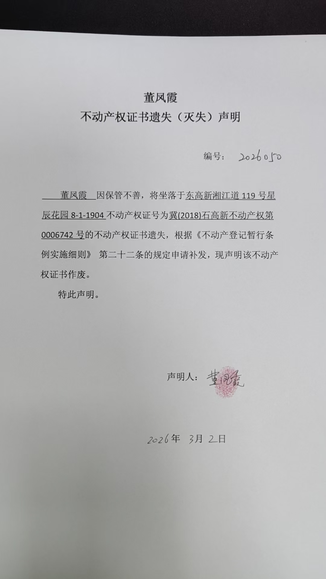 董凤霞不动产权证书遗失(灭失)声明(编号:2026050)