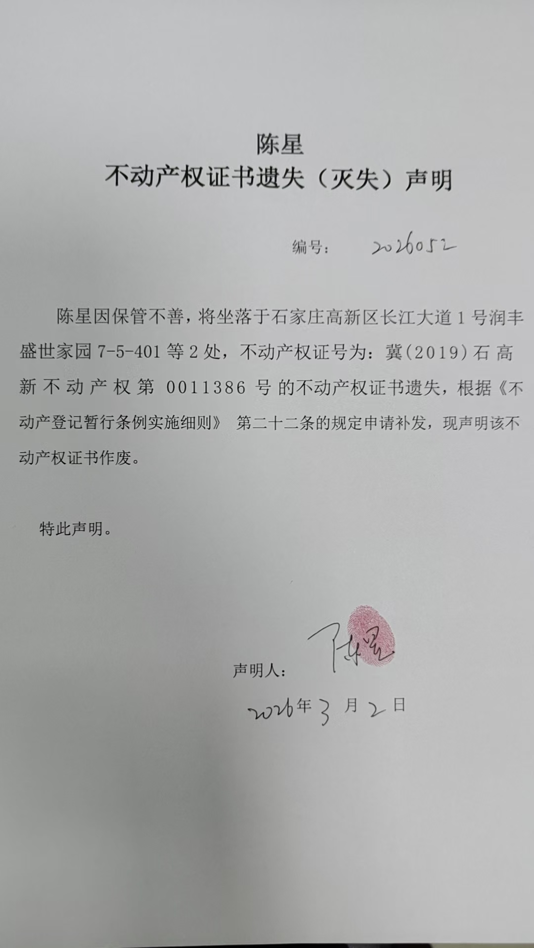 陈星不动产权证书遗失(灭失)声明(编号:2026052)