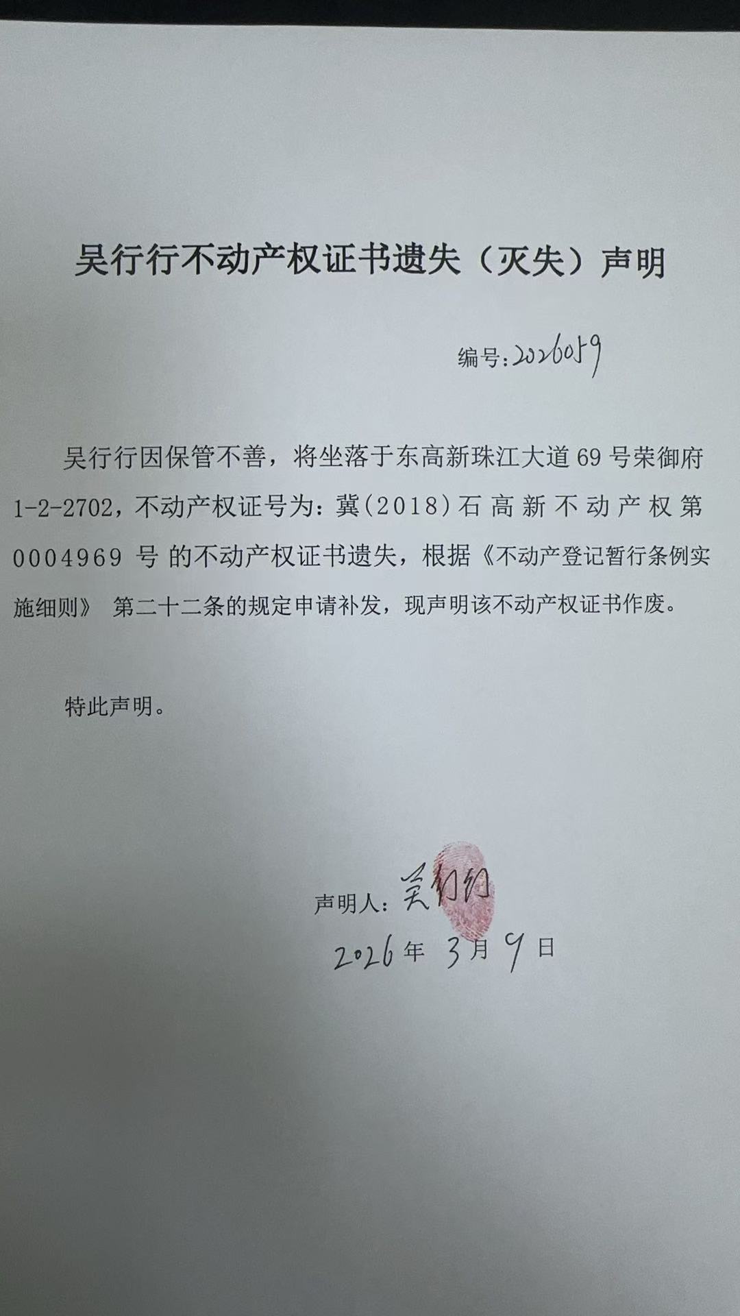 吴行行不动产权证遗失(灭失)声明(编号:2026059)