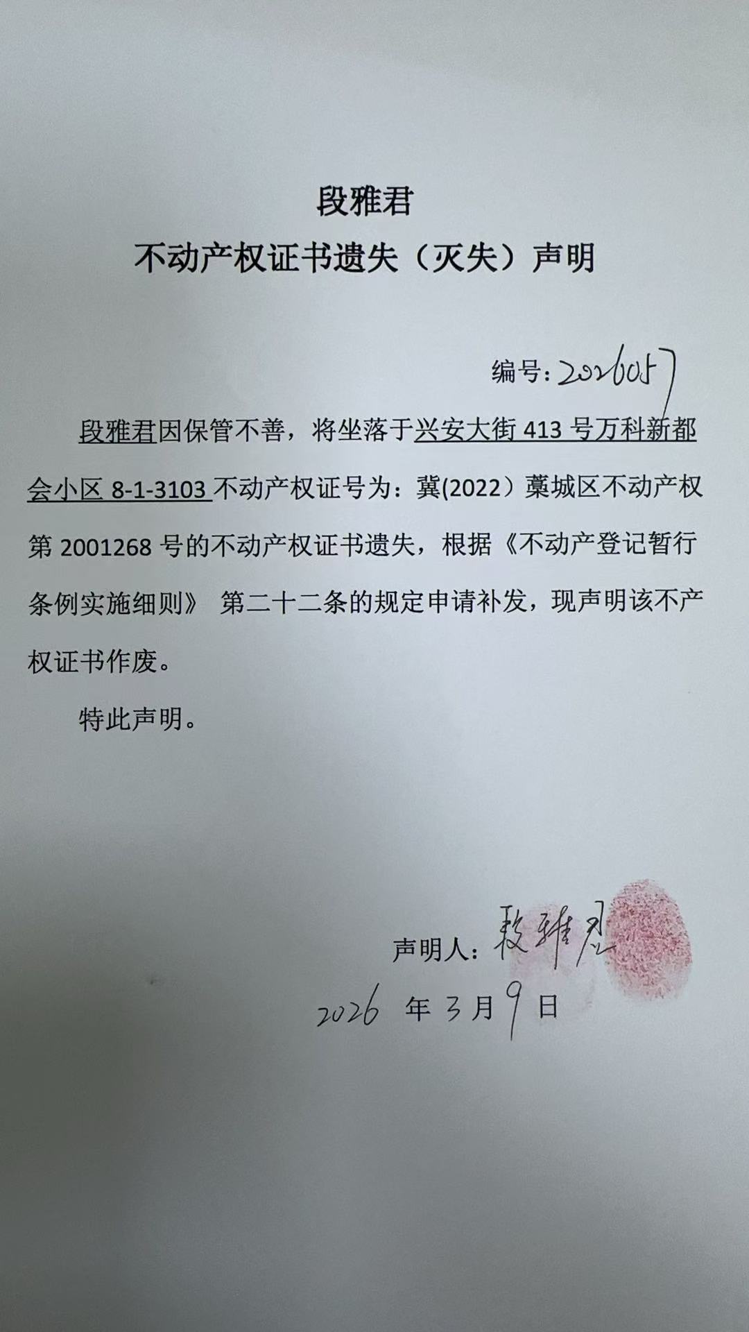 段雅君不动产权证书遗失(灭失)声明(编号:2026057)