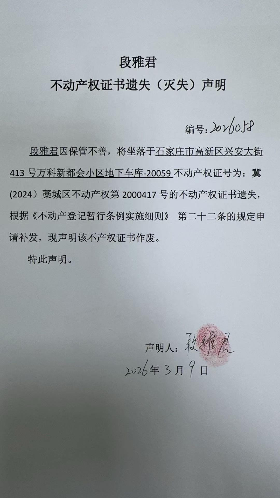 段雅君不动产权证书遗失(灭失)声明(编号:2026058)