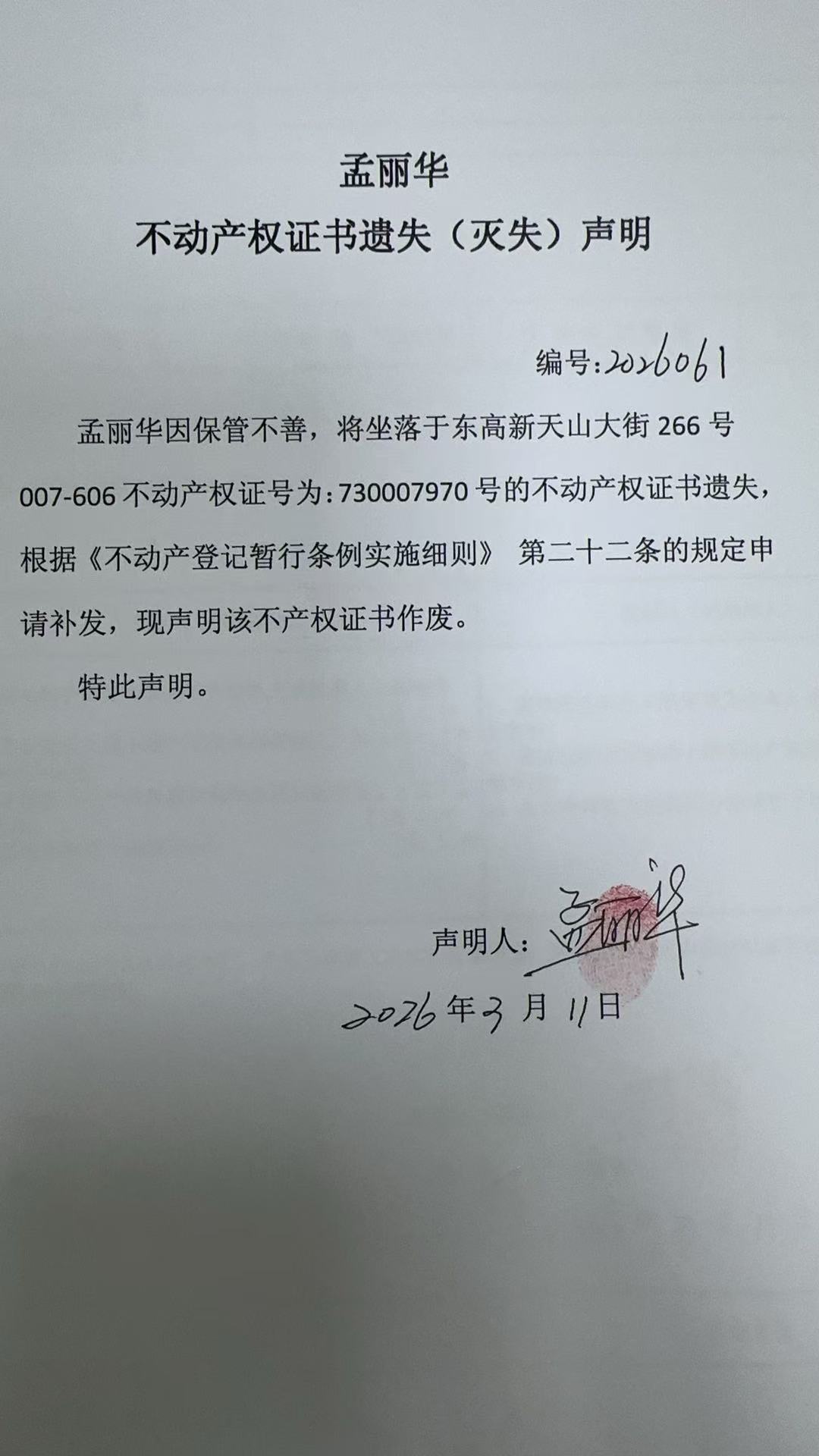 孟丽华不动产权证书遗失(灭失)声明(编号:2026061)
