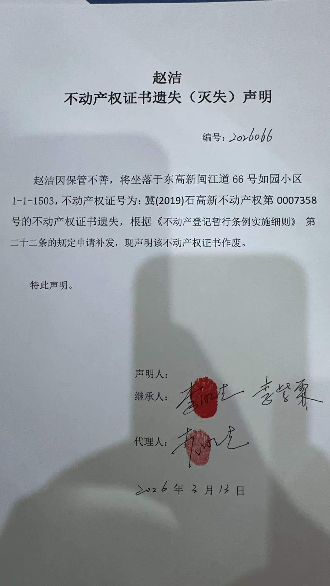 赵洁不动产权证书遗失(灭失)声明(编号2026066)