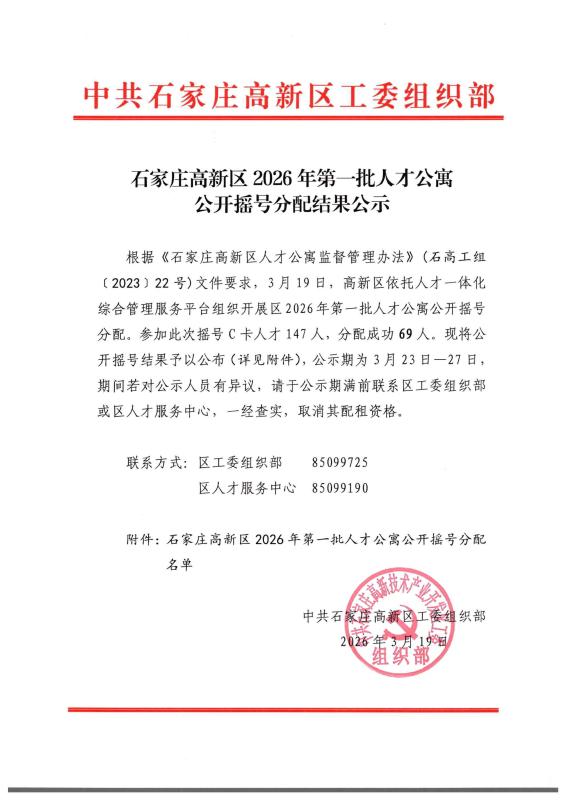 石家庄高新区2026年第一批人才公寓公开摇号分配结果的公示