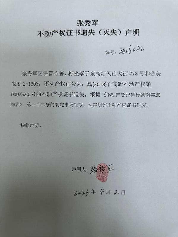 张秀军不动产权证书遗失(灭失)声明(编号:2026082)