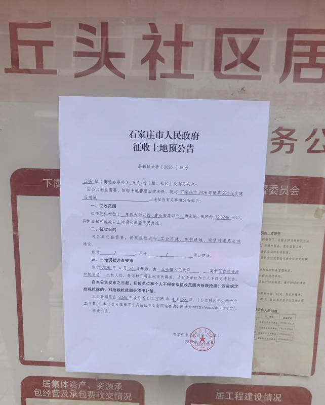 石家庄市人民政府征收土地预公告(2026年 18号)